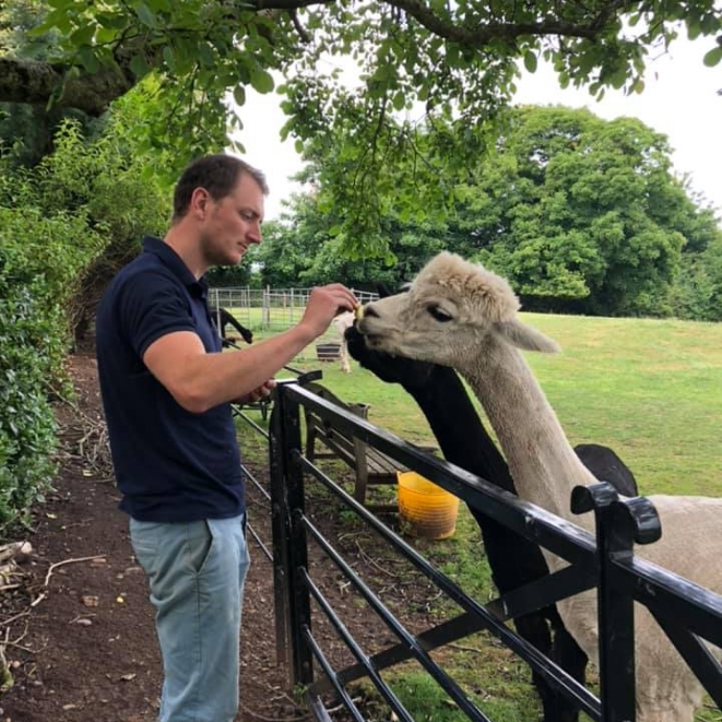Veterinary surgeon - Dan Cooper, feeding Henry the Alpaca apple slices, after successful treatment for a wound on his leg.